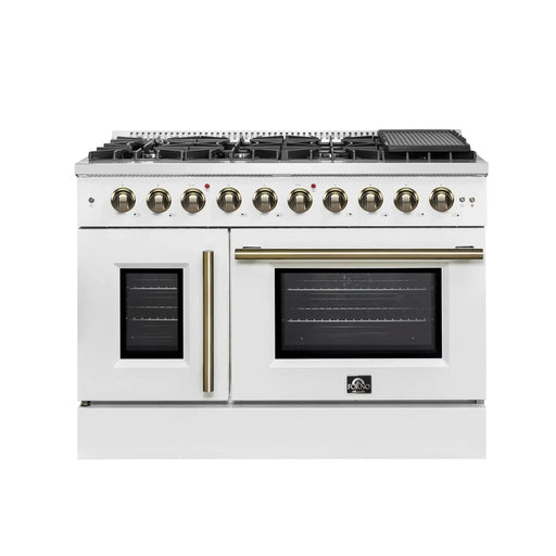 View full detailsForno Galiano 48"French Door Freestanding All Gas Range, White with Antique Brass Trim, FFSGS6444-48WHT Redefine your kitchen with the Forno Galian...