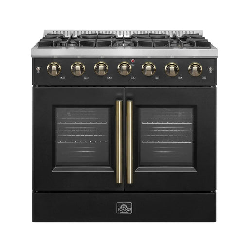 View full detailsForno Galiano 36." French Door All Gas Range, Black, Antique Brass Trim,FFSGS6444-36BLK Elevate your kitchen with the Forno Galiano 36" French Door...