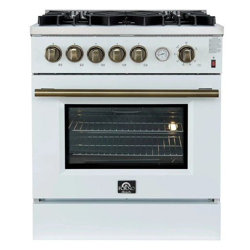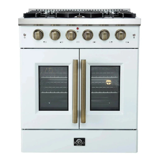 View full detailsForno Galiano 30" French Door Gas on Gas Range White Antique Brass Trim FFSGS6444-30WHT The Forno Galiano 30" French Door Gas Range combines bold e...